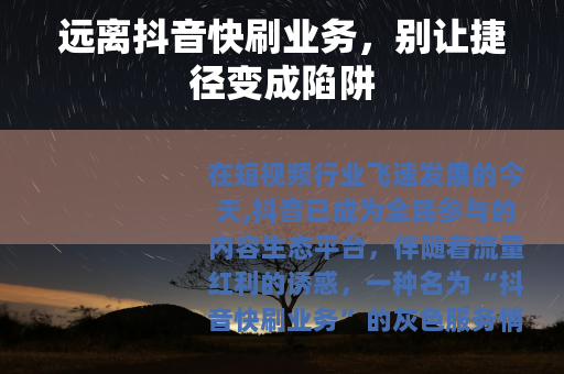 在短视频行业飞速发展的今天,抖音已成为全民参与的内容生态平台,伴随着流量红利的诱惑,一种名为“抖音快刷业务”的灰色服务悄然蔓延——声称只需支付费用,就能快速提升粉丝量、点赞数、评论数甚至播放量,让账号“一夜成名”,看似便捷的“流量捷径”,实则是布满风险的陷阱,不仅违背平台规则,更会让用户付出沉重代价。