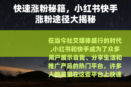 在当今社交媒体盛行的时代,小红书和快手成为了众多用户展示自我、分享生活和推广产品的热门平台,许多人都渴望在这些平台上快速积累粉丝,提升自己的影响力,究竟哪里能让小红书和快手快速涨粉丝呢?今天就来为您详细介绍一些有效的方法。
