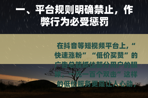 在抖音等短视频平台上,“快速涨粉”“低价买赞”的广告总能抓住部分用户的眼球,一元一百个双击”这样的低价服务更是让人心动,这种看似“性价比极高”的操作,背后却藏着不少隐患,甚至可能让账号陷入无法挽回的困境。 抖音的社区规范和运营规则中,早已明确禁止任何形式的刷赞、刷量、刷粉等作弊行为,平台的智能算法会通过多维度数据检测(如点赞来源的真实性、互动的连贯性、账号的活跃时间等),精准识别非自然增长的账号,一旦被判定违规,账号将面临限流、降权的处罚——发布的视频无法进入推荐流,甚至仅自己可见;严重者会被永久封号,此前积累的内容和粉丝将全部清零,付出的时间与精力付诸东流。