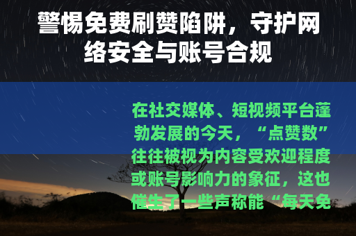网络空间的信任建立在真实之上,虚假的点赞数无法带来真正的影响力,反而会让账号陷入风险,与其沉迷于“免费刷赞”的幻象,不如脚踏实地打磨内容,用真实的互动赢得用户的认可,守护账号安全,远离违规工具,才是网络时代的明智选择。