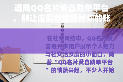 在社交网络中,QQ名片赞曾是许多用户展示个人魅力与社交活跃度的小窗口,随着“QQ名片赞自助单平台”的悄然兴起,不少人开始被“快速涨赞”“一键下单”的噱头吸引,却忽略了背后潜藏的巨大风险,这些平台看似便捷,实则是游走在规则边缘的“陷阱”,不仅可能损害你的账号安全,更会扭曲真实的社交价值。