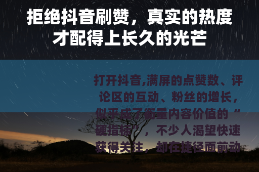拒绝抖音刷赞,不仅是遵守平台规则,更是对自己的负责,让我们用真实的内容、真诚的态度,在抖音的舞台上发光发热——这样的点赞,才值得骄傲;这样的账号,才能走得更远。