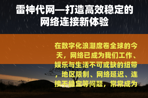 从游戏娱乐到工作学习,从个人需求到企业应用,雷神代网始终以“高效、稳定、安全”为核心,为用户打造全方位的网络优化解决方案,在未来,雷神代网将继续深耕技术创新,不断提升服务质量,成为每一位用户信赖的“网络伙伴”,让数字世界的连接更顺畅、更自由。