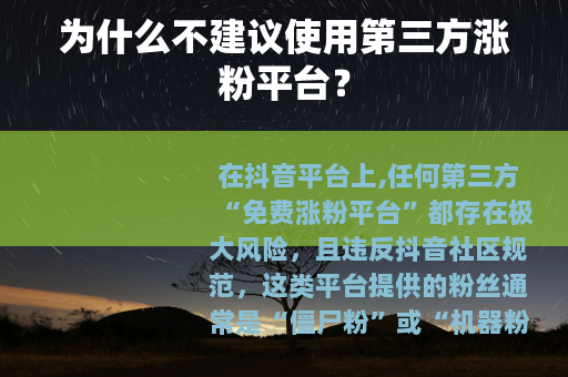 在抖音平台上,任何第三方“免费涨粉平台”都存在极大风险,且违反抖音社区规范,这类平台提供的粉丝通常是“僵尸粉”或“机器粉”,不仅无法带来真实互动,还会降低账号权重,甚至导致账号被限流、降权、封禁等处罚,严重影响账号的长期发展。