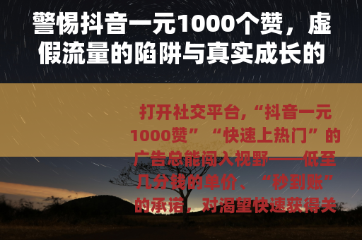 打开社交平台,“抖音一元1000赞”“快速上热门”的广告总能闯入视野——低至几分钱的单价、“秒到账”的承诺,对渴望快速获得关注的创作者来说,仿佛是条“捷径”,但真相是:所有“低价刷赞”的宣传,都是包裹着糖衣的陷阱。