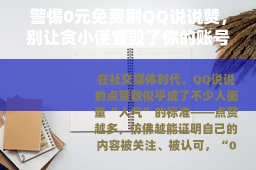 在社交媒体时代,QQ说说的点赞数似乎成了不少人衡量“人气”的标准——点赞越多,仿佛越能证明自己的内容被关注、被认可。“0元免费刷QQ说说赞”的广告悄然出现在各类平台:“无需付费,一键秒赞,轻松涨人气”,这样的诱惑让很多人动了心,但真相是,所谓的“免费刷赞”,往往是包裹着糖衣的陷阱,背后藏着账号被盗、信息泄露甚至财产损失的风险。
