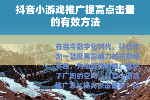 在当今数字化时代,抖音作为一款极具影响力的短视频平台,为小游戏的推广提供了广阔的空间,抖音小游戏推广怎么提高点击量呢?以下是一些实用的方法。