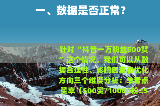 针对“抖音一万粉丝500赞”这个情况,我们可以从数据合理性、影响因素和优化方向三个维度分析: 单看点赞率(500赞/10000粉=5%),这个数值在抖音中小账号(1万-10万粉)里属于合理区间:
