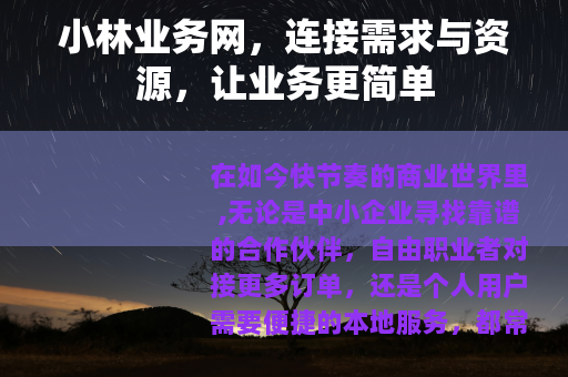 无论是企业还是个人,在小林业务网都能找到属于自己的机会——它不仅是一个对接平台,更是一个资源共享的社区,如果你还在为业务对接发愁,不妨打开小林业务网,让它成为你业务路上的“好帮手”。