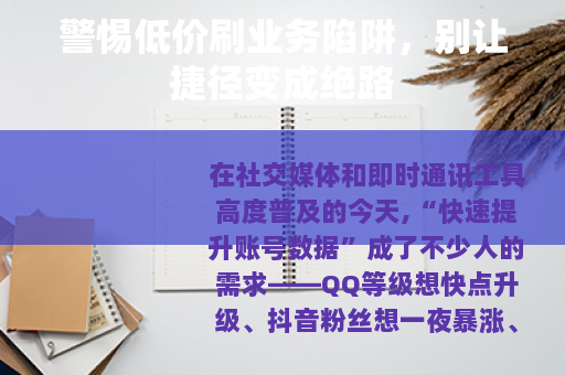 在社交媒体和即时通讯工具高度普及的今天,“快速提升账号数据”成了不少人的需求——QQ等级想快点升级、抖音粉丝想一夜暴涨、业务量想轻松“达标”……网络上充斥着“低价刷QQ业务”“抖音刷粉刷赞”的网站广告,看似诱人的“捷径”背后,却藏着重重风险。