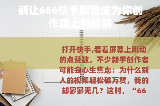 打开快手,看着屏幕上跳动的点赞数,不少新手创作者可能会心生焦虑:为什么别人的视频轻松破万赞,我的却寥寥无几?这时,“666快手刷赞”之类的关键词或许会悄悄钻进视野——仿佛只要花点钱,就能快速拥有亮眼的数据、涨粉变现,但真相是,刷赞从来都不是捷径,而是一条布满荆棘的“死路”。