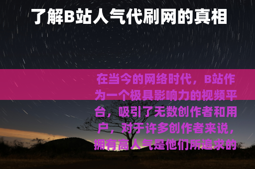 在当今的网络时代,B站作为一个极具影响力的视频平台,吸引了无数创作者和用户,对于许多创作者来说,拥有高人气是他们所追求的目标之一,在这种背景下,所谓的“B站人气代刷网”应运而生。