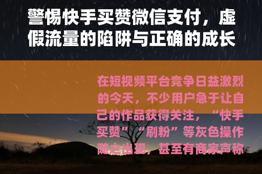 在短视频平台竞争日益激烈的今天,不少用户急于让自己的作品获得关注,“快手买赞”“刷粉”等灰色操作随之出现,甚至有商家声称支持微信支付,但这种看似“便捷”的涨粉方式,实则是布满风险的陷阱——不仅违反平台规则,还可能带来财产损失与账号危机,更违背了内容创作的初衷。