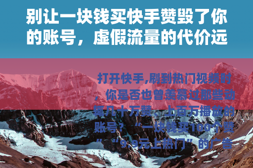 打开快手,刷到热门视频时,你是否也曾羡慕过那些动辄几十万赞、上百万播放的账号?“一块钱买100个赞”“9.9元上热门”的广告悄然出现在视线里——只需几块钱,就能让自己的视频数据“好看”起来,这对急于涨粉的新手来说,似乎是条“捷径”,但真相是:“买赞”不仅是平台严令禁止的违规行为,更可能让你付出账号被封、隐私泄露、钱打水漂的代价,最终得不偿失。