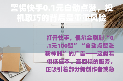 打开快手,偶尔会刷到“0.1元100赞”“自动点赞涨粉神器”的广告——这类看似低成本、高回报的服务,正吸引着部分新创作者或急于提升数据的用户,但在“一键涨赞”的诱惑背后,藏着平台规则的红线、账号安全的隐患,以及对创作生态的破坏。