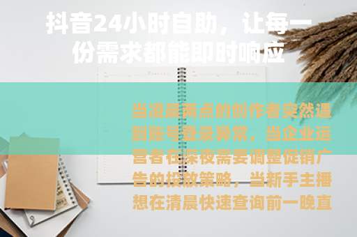当凌晨两点的创作者突然遇到账号登录异常,当企业运营者在深夜需要调整促销广告的投放策略,当新手主播想在清晨快速查询前一晚直播的互动数据——抖音的24小时自助服务,正成为连接用户需求与平台能力的“隐形桥梁”,在这个碎片化时间主导的时代,“随时可用、自主可控”的服务模式,正在重新定义抖音与用户的互动方式。