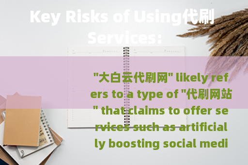 "大白云代刷网" likely refers to a type of "代刷网站" that claims to offer services such as artificially boosting social media followers, likes, views, comments, or other online engagement metrics. However, using such services carries significant risks and is not recommended: