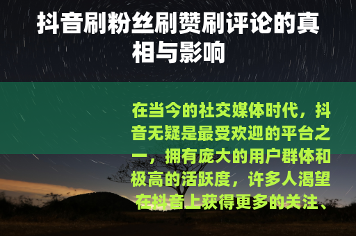 在当今的社交媒体时代,抖音无疑是最受欢迎的平台之一,拥有庞大的用户群体和极高的活跃度,许多人渴望在抖音上获得更多的关注、点赞和评论,以提升自己的影响力和知名度,抖音刷粉丝刷赞刷评论的现象便应运而生。