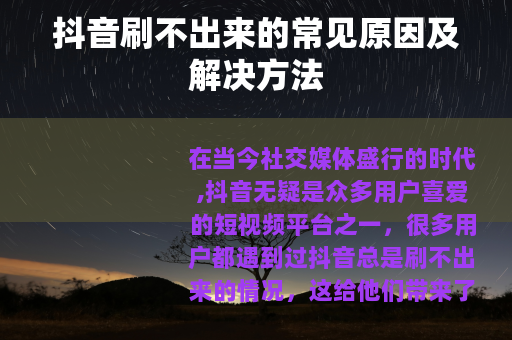 当遇到抖音总是刷不出来的情况时,不要慌张,可以按照上述方法逐步排查和解决问题,以便能够继续在抖音上享受丰富多彩的短视频内容,与众多用户进行互动和交流。 对您有所帮助,您可以根据实际需求对文章进行调整和修改,如果您还有其他问题,欢迎继续向我提问。