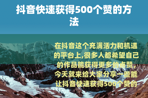 在抖音这个充满活力和机遇的平台上,很多人都希望自己的作品能获得更多的点赞,今天就来给大家分享一些能让抖音快速获得500个赞的实用方法。 质量是关键,要确保你的视频内容有趣、有价值且具有独特性,可以从大家感兴趣的热点话题入手,比如当下流行的美食制作、时尚穿搭、健身教程等,这样能吸引更多用户的关注,在视频的拍摄上要注重画面的稳定性和清晰度,以及光线的运用,好的视觉效果会让用户更愿意停留观看你的视频。
