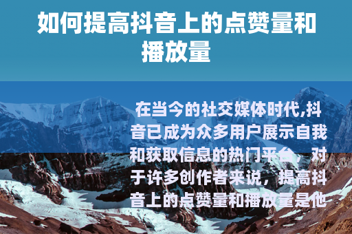 在当今的社交媒体时代,抖音已成为众多用户展示自我和获取信息的热门平台,对于许多创作者来说,提高抖音上的点赞量和播放量是他们努力追求的目标,究竟有哪些方法可以帮助我们实现这一目标呢? 质量是关键,要制作出吸引人的视频内容,需要关注当下的热点话题和用户兴趣点,了解目标受众的喜好,创作出能够引起他们共鸣的视频,可以通过讲述有趣的故事、分享实用的知识或展示独特的才艺等方式,吸引用户的关注并让他们产生兴趣,确保视频的画面清晰、音质良好,剪辑流畅,给用户带来良好的观看体验。