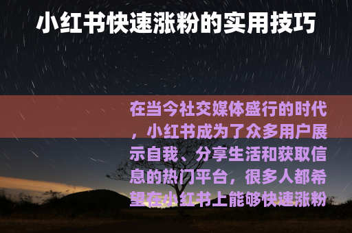 想要在小红书上快速涨粉,需要综合运用以上这些技巧,不断努力和实践,持续为用户提供优质、有价值的内容,建立良好的用户关系,才能在这个竞争激烈的平台上脱颖而出,实现自己的涨粉目标。