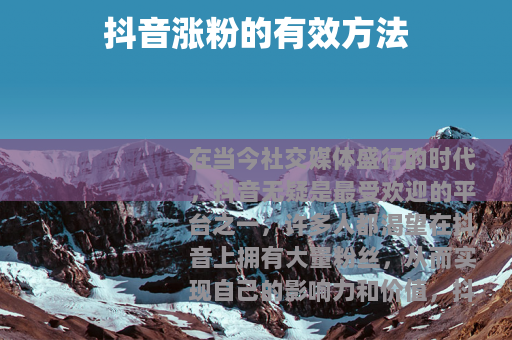 在当今社交媒体盛行的时代,抖音无疑是最受欢迎的平台之一,许多人都渴望在抖音上拥有大量粉丝,从而实现自己的影响力和价值,抖音怎样有粉丝呢?以下是一些实用的方法。
