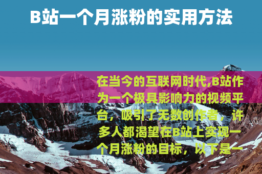 在当今的互联网时代,B站作为一个极具影响力的视频平台,吸引了无数创作者,许多人都渴望在B站上实现一个月涨粉的目标,以下是一些切实可行的方法。 创作是关键,要想在B站快速涨粉,必须提供有价值、有趣且独特的内容,了解目标受众的兴趣点,针对他们的喜好制作视频,如果你的受众是年轻人,可以制作关于流行文化、游戏攻略、美食探店等热门话题的视频,确保视频的质量,包括清晰的画面、良好的音质以及流畅的剪辑,高质量的内容能够让观众更愿意停留和关注你的频道。