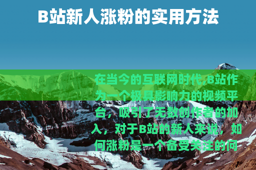 在当今的互联网时代,B站作为一个极具影响力的视频平台,吸引了无数创作者的加入,对于B站的新人来说,如何涨粉是一个备受关注的问题,以下是一些能够帮助B站新人有效涨粉的方法。 创作是关键,新人要明确自己的定位和擅长的领域,比如游戏、美食、美妆、知识科普等等,专注于一个特定领域,能够让观众更容易记住你,也有利于系统将你的视频推荐给更精准的用户群体,在创作内容时,要注重视频的质量,包括清晰的画面、良好的音质以及吸引人的剪辑,一个制作精良的视频会给观众留下更好的印象,增加他们关注你的可能性。