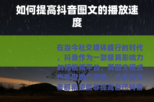 在当今社交媒体盛行的时代,抖音作为一款极具影响力的短视频平台,其图文模式也备受用户喜爱,许多创作者都希望能够提高自己抖音图文的播放速度,从而获得更多的关注和流量,以下是一些可以帮助你提高抖音图文播放速度的有效方法。