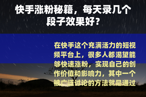 在快手这个充满活力的短视频平台上,很多人都渴望能够快速涨粉,实现自己的创作价值和影响力,其中一个被广泛讨论的方法就是通过每天录制段子来吸引观众,那么快手想要涨粉丝每天录几个段子比较合适呢?