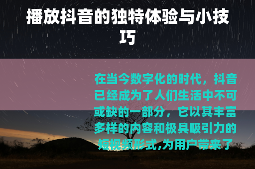 播放抖音是一种非常有趣和有意义的活动,它为我们的生活增添了许多色彩和乐趣,让我们充分享受在抖音的世界里,发现更多的美好与惊喜。