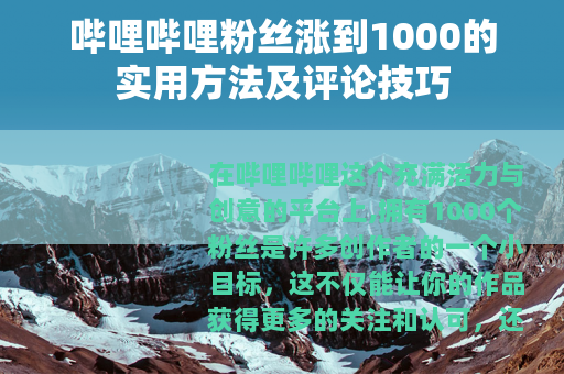 在哔哩哔哩这个充满活力与创意的平台上,拥有1000个粉丝是许多创作者的一个小目标,这不仅能让你的作品获得更多的关注和认可,还能为你在平台上的发展打下坚实的基础,以下是一些能帮助你在哔哩哔哩上把粉丝涨到1000的有效方法。 质量是关键,你需要制作出有趣、有价值且独特的视频内容,无论是搞笑的段子、专业的知识讲解还是精彩的游戏操作,都要确保能吸引观众的眼球并让他们产生共鸣,在策划视频内容时,要深入了解你的目标受众,知道他们的兴趣点和需求,这样才能制作出符合他们口味的视频,从而提高视频的播放量和粉丝转化率。