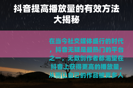在当今社交媒体盛行的时代,抖音无疑是最热门的平台之一,无数创作者都渴望在抖音上获得更高的播放量,从而让自己的作品被更多人看到,实现自己的创作价值和商业目标,如何才能有效提高抖音作品的播放量呢?以下是一些经过实践验证的方法。