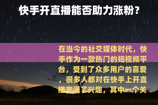 在当今的社交媒体时代,快手作为一款热门的短视频平台,受到了众多用户的喜爱,很多人都对在快手上开直播充满了兴趣,其中一个关键的问题便是:快手开直播有助于涨粉吗?