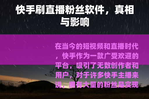 在当今的短视频和直播时代,快手作为一款广受欢迎的平台,吸引了无数创作者和用户,对于许多快手主播来说,拥有大量的粉丝是实现商业价值和个人影响力的重要基础,市场上出现了各种各样声称可以快速增加快手直播粉丝的软件,这些软件看似诱人,但实则隐藏着诸多问题。