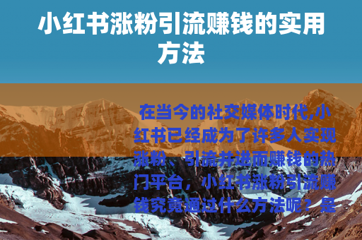 要在小红书上实现涨粉引流赚钱,需要不断努力和尝试,通过优质的内容、良好的互动、合理的运营策略等多方面的努力,逐步积累粉丝和影响力,从而实现自己的目标。
