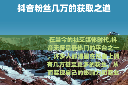 在当今的社交媒体时代,抖音无疑是最热门的平台之一,许多人都渴望在抖音上拥有几万甚至更多的粉丝,从而实现自己的影响力和商业价值,抖音粉丝几万究竟是怎么来的呢?