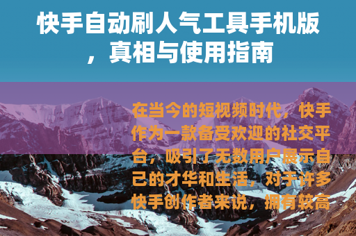 在当今的短视频时代,快手作为一款备受欢迎的社交平台,吸引了无数用户展示自己的才华和生活,对于许多快手创作者来说,拥有较高的人气和关注度是他们所期望的,这也使得一些所谓的快手自动刷人气工具手机版应运而生。