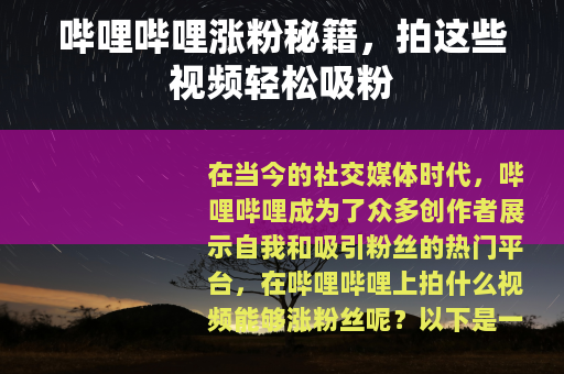 在当今的社交媒体时代,哔哩哔哩成为了众多创作者展示自我和吸引粉丝的热门平台,在哔哩哔哩上拍什么视频能够涨粉丝呢?以下是一些实用的建议。