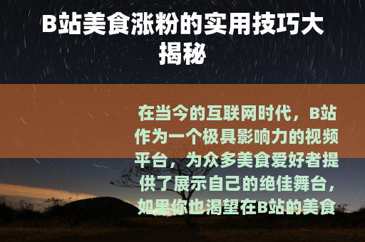 在当今的互联网时代,B站作为一个极具影响力的视频平台,为众多美食爱好者提供了展示自己的绝佳舞台,如果你也渴望在B站的美食领域中收获大量粉丝,那么以下这些实用的涨粉技巧你可千万不能错过。 的独特性是关键,在美食领域,虽然各类美食视频层出不穷,但你需要找到属于自己的独特风格和切入点,可以是专注于某一特定地域的特色美食,深入挖掘其背后的文化故事和制作工艺,让观众在欣赏美食的同时,也能感受到浓厚的文化底蕴;也可以是开创一种全新的美食制作方式或创意搭配,给观众带来意想不到的惊喜和新鲜感,将传统的中式点心与现代的烘焙技巧相结合,制作出独具特色的新中式甜点,这样的内容往往能吸引更多用户的关注。