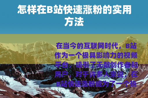 在当今的互联网时代,B站作为一个极具影响力的视频平台,吸引了无数创作者和用户,对于许多人来说,在B站快速涨粉成为了一个热门话题和追求的目标,以下是一些能够帮助你在B站快速涨粉的有效方法。 质量是关键,要确保你的视频内容有独特性和吸引力,无论是搞笑、知识科普、美食制作还是游戏攻略等各种类型,都要做到精益求精,在制作视频前,深入了解你的目标受众,明确他们的兴趣点和需求,然后根据这些来策划和制作内容,这样才能更容易引起观众的共鸣,从而增加粉丝的关注度。