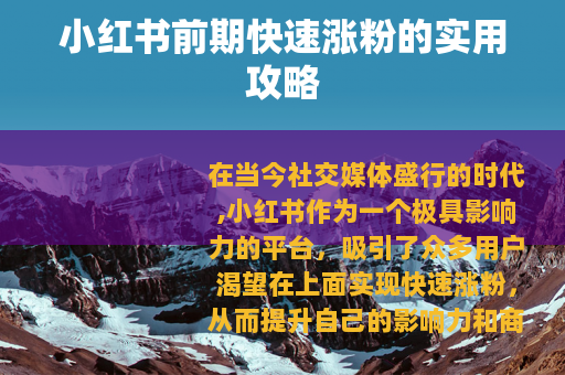 在当今社交媒体盛行的时代,小红书作为一个极具影响力的平台,吸引了众多用户渴望在上面实现快速涨粉,从而提升自己的影响力和商业价值,以下是一些小红书前期快速涨粉的有效方法。