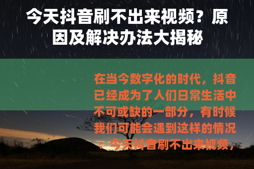 在当今数字化的时代,抖音已经成为了人们日常生活中不可或缺的一部分,有时候我们可能会遇到这样的情况:今天抖音刷不出来视频,这无疑会给我们带来一些困扰,那么究竟是什么原因导致了这种情况的发生呢?