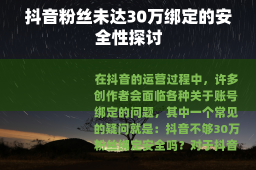 在抖音的运营过程中,许多创作者会面临各种关于账号绑定的问题,其中一个常见的疑问就是:抖音不够30万粉丝绑定安全吗?