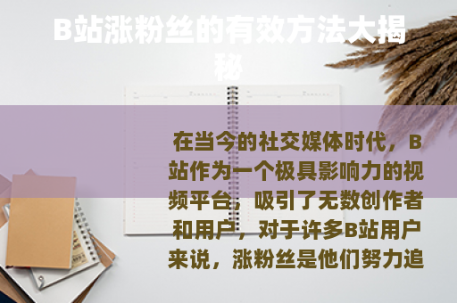 在当今的社交媒体时代,B站作为一个极具影响力的视频平台,吸引了无数创作者和用户,对于许多B站用户来说,涨粉丝是他们努力追求的目标之一,如何在B站上有效地涨粉丝呢? 质量是关键,创作优质、有吸引力的视频内容是吸引粉丝的基础,要确保视频具有独特的创意和观点,能够引起观众的兴趣和共鸣,无论是搞笑、知识科普、美食制作还是游戏攻略等各种类型的视频,都要在内容上做到精益求精,在制作知识科普类视频时,要深入研究相关主题,提供准确、有用且易懂的信息,让观众在观看后能真正有所收获。
