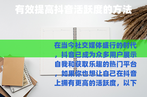 通过以上这些方法的综合运用,相信你可以有效地提高自己在抖音上的活跃度,吸引更多的关注和喜爱,在抖音这个充满活力的平台上展现出自己的独特魅力。