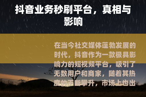 在当今社交媒体蓬勃发展的时代,抖音作为一款极具影响力的短视频平台,吸引了无数用户和商家,随着其热度的不断攀升,市场上也出现了一些所谓的抖音业务秒刷平台,声称可以快速提升抖音账号的各种数据指标,如粉丝量、点赞数、评论数等。