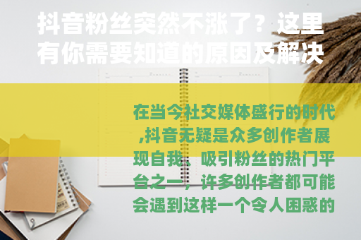 在当今社交媒体盛行的时代,抖音无疑是众多创作者展现自我、吸引粉丝的热门平台之一,许多创作者都可能会遇到这样一个令人困惑的问题:抖音粉丝突然不涨了,这一情况可能会让创作者们感到焦虑和迷茫,不知道问题出在哪里,也不知道该如何解决。