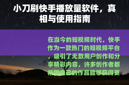 在当今的短视频时代,快手作为一款热门的短视频平台,吸引了无数用户创作和分享精彩内容,许多创作者都希望自己的作品能够获得更多的播放量,从而提高知名度和影响力,在这样的需求下,一些刷播放量的软件应运而生,小刀刷快手播放量软件就是其中之一。